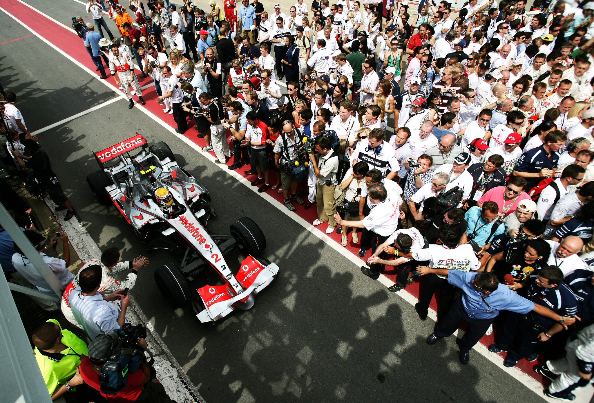 British McLaren Formula One driver Lewis Hamilton drives his MP4-22 car along the pit lane past his celebrating team after claiming his first Grand Prix win at the 2007 Canadian Grand Prix held at the Circuit Gilles Villeneuve on 10th June 2007. (Photo by Darren Heath/Getty Images)