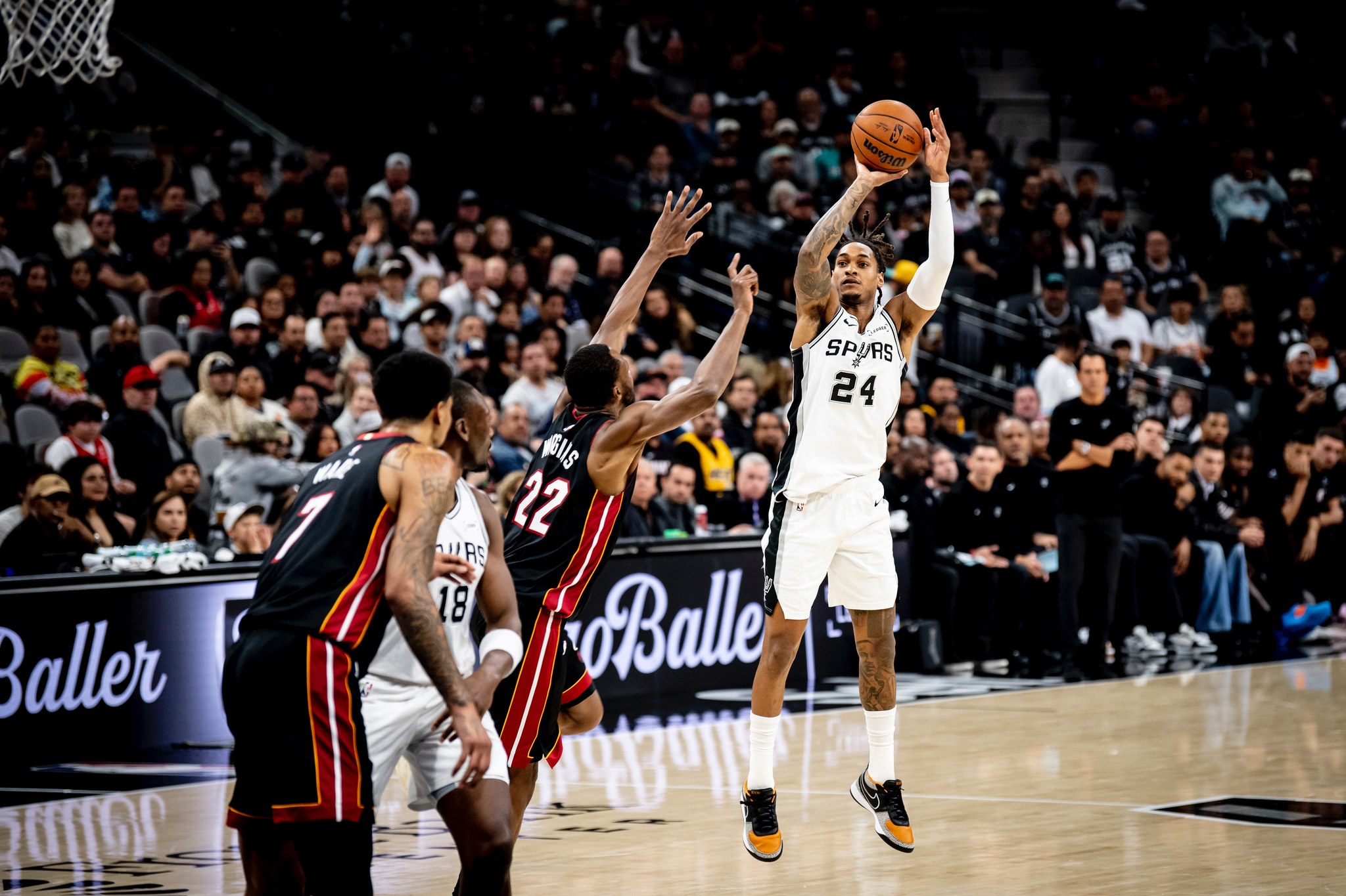 during the first quarter against the Miami Heat at the Frost Bank Center in San Antonio, Texas Thursday, October 30, 2025.